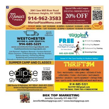 Box Top Marketing partners with pizzerias in Westchester County to offer shared ad space on flyers affixed to the tops of their pizza boxes. For years, we have seen this unique, local ad-sharing opportunity benefit hundreds of small businesses and pizzerias in the area. Our format features one, two, three, or four advertisers on a flyer. Our goal is to increase awareness of your business and help you grow sales.